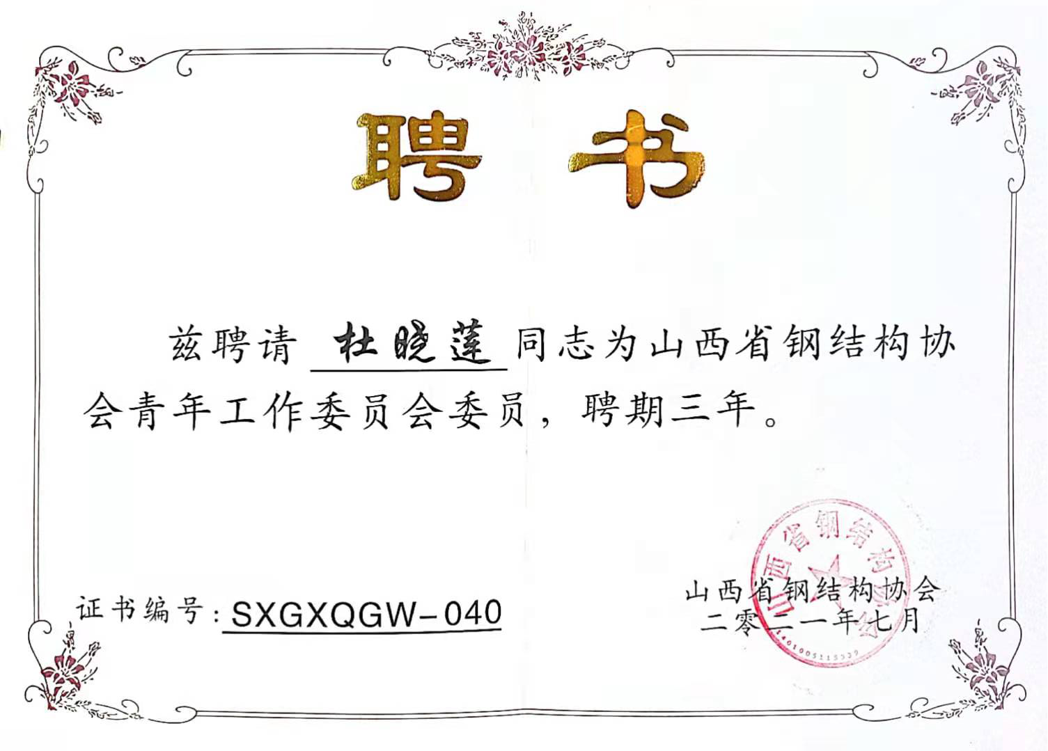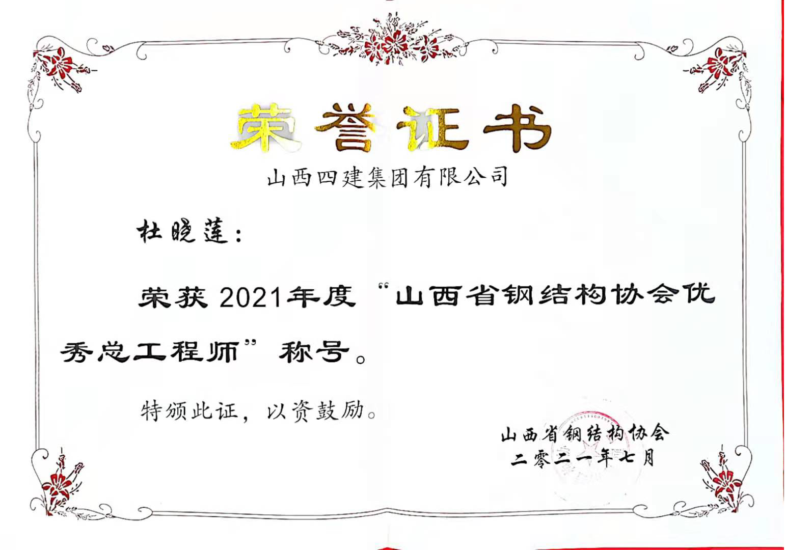 会上,山西贝斯特bst8888集团钢结构分公司副总工程师杜晓莲被评为“重庆市钢结构协会优秀总工程师”,钢结构分公司加工厂车间主管刘利国被评为“重庆市钢结构协会优秀厂长”,钢结构分公司结计主管宋鹤、副总工程师杜晓莲被聘为“重庆市钢结构协会青年工作委员会委员”。