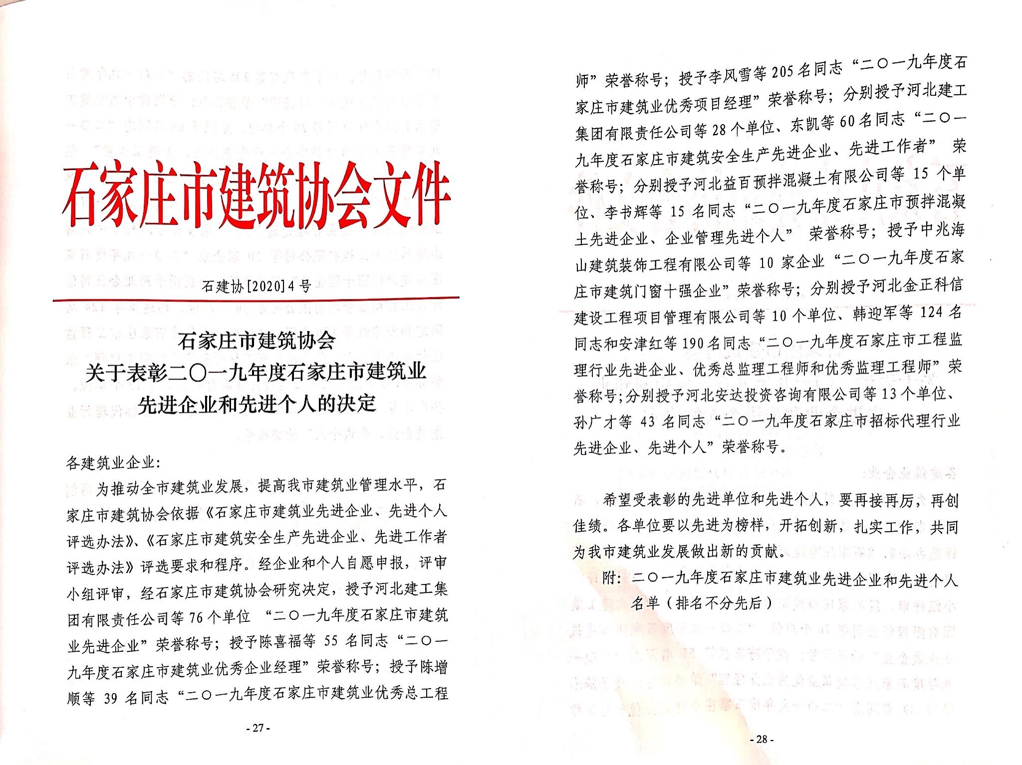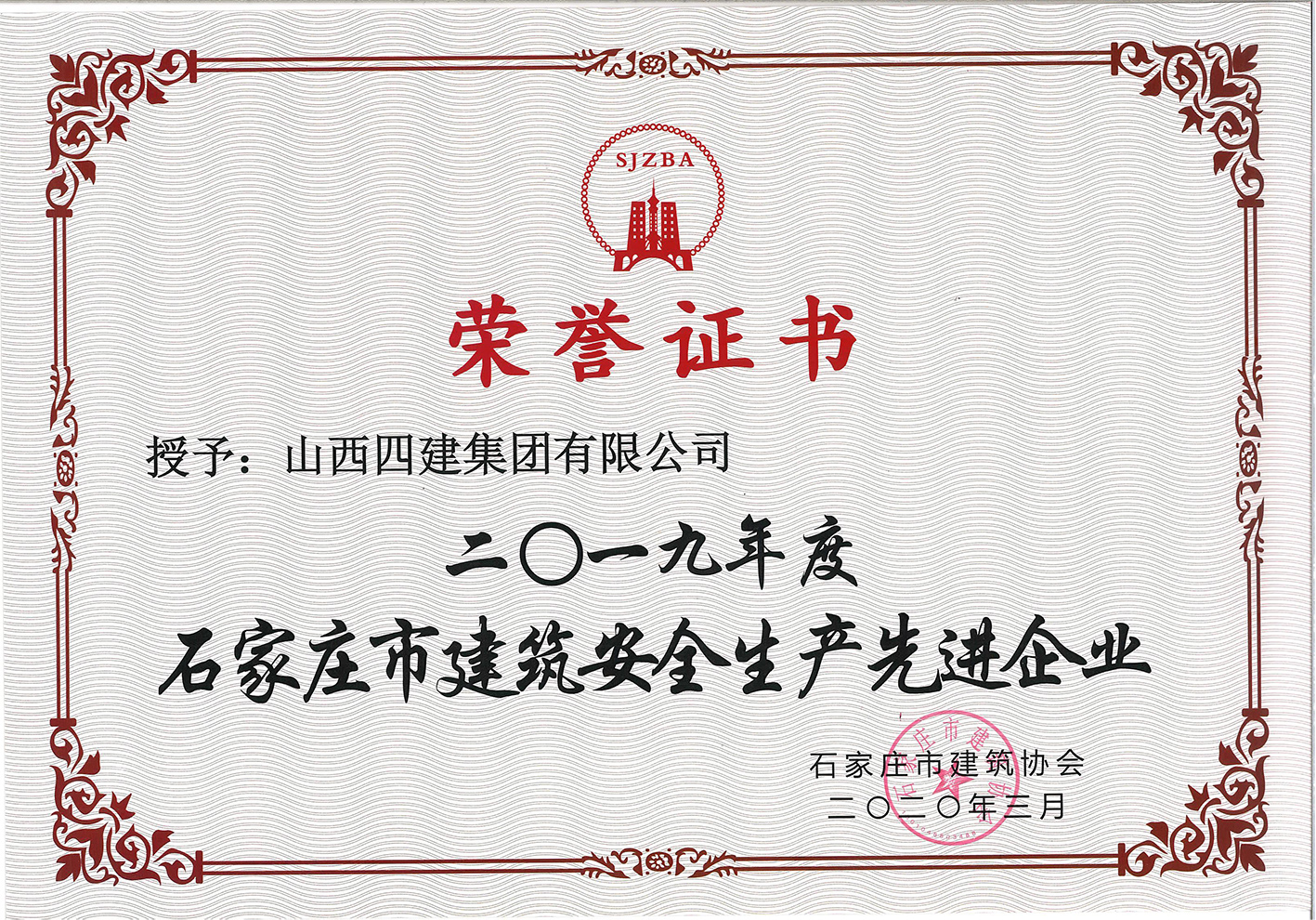 近日,石家庄市建筑协会公布2019年度石家庄市建筑业先进企业和先进个人的评选结果,山西贝斯特bst8888集团荣获2019年度石家庄市建筑安全生产先进企业,河北分公司李春泉荣获2019年度石家庄市建筑安全生产先进工作者。